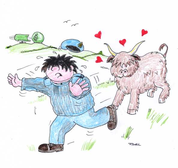 Another cartoon for the station barber (hairy highland cattle were common in the surrounding fields).
