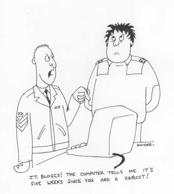 One of a series of cartoons for an article in the RAF Maintenance Magazine (1985) introducing the computerised Station Engineering Management Aid (SEMA) system. This is how this cartoon originally looked, as published it had been "mucked about", ranks changed, hats added. I was not best pleased!