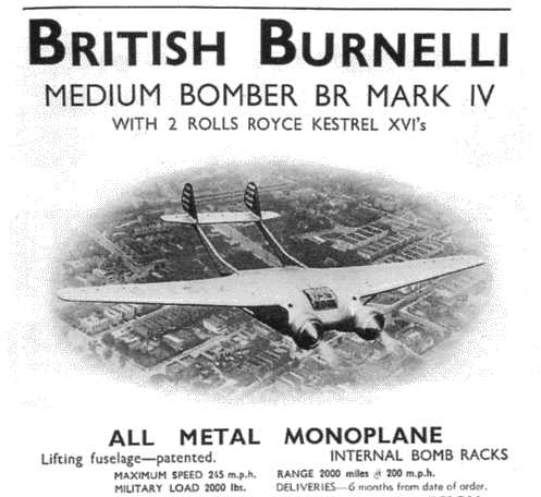 The January 1937 advert for the "British Burnelli Medium Bomber BR Mk IV" features a photo of the Burnelli UB-14B with some extravagant claims for performance and a promise of delivery within 6 months. The project was later renamed the "Clyde Corsair".