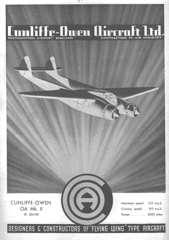 And so ended the Cunliffe-Owen OA-1 "Flying Wing", although the company did continue to look into possible future developments. It is possible that the design they prepared for an Air Ministry 1943 specification for a twin-engined aircraft to operate off aircraft carriers (S6/43, later reissued as S11/43) had a "lifting fuselage" layout. An ambitious design for a post-war 4-engined transatlantic airliner that looked like the Lockheed Constellation fell through. Cunliffe-Owen reverted to a more modest conventional layout for their "Concordia" 10-passenger feeder-liner, the prototype of which flew in 1947. There was no market for such a new aircraft in a world awash with cheap ex-military transports like the DC3 Dakota and the failure of the project saw Cunliffe-Owen withdraw from the aviation marketplace. The death of Sir Hugo Cunliffe-Owen, in December 1947, also played a part in the winding-up of the company which went into receivership in July 1948. Some of the factory space continued to be used for the assembly of two Cierva W11 "Air Horse" helicopters by the G&J Weir company, the first of which flew in December 1948. The construction of the M27 motorway separated the Cunliffe-Owen factory from Eastleigh Airfield (now Southampton Airport). The site was occupied for many years by the Ford Motor Company, which built the Transit van there.