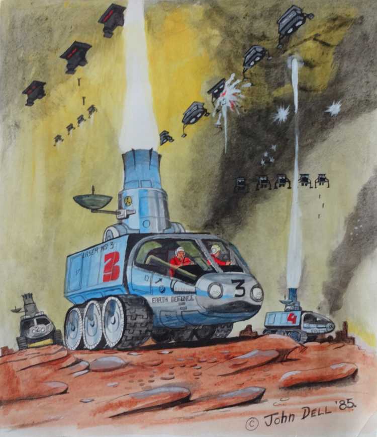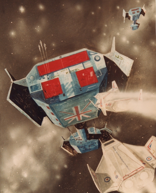 This is one painting I did sell: HM Spaceship "Ark Royal". I know it hung in the window of a Science Fiction bookshop in London for a while.