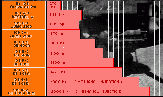 While the Spitfire's airframe was big enough to be upgraded from the Merlin to the larger Griffon engine, the Bf109 was too small to accept the larger DB603 engine of 44.5 litres capacity. So, the next stage in the engine story of the Bf109 was the DB605A, which was essentially a DB601 with a slightly larger bore (only 4 mm wider) to give 35.7 litres capacity and made to run some 400 rpm faster to give 25 per cent more power while retaining the overall dimensions of the earlier DB601. Intended for the 109 G series, production was delayed, so the first of the G line, the G-0, made do with the DB601E. The DB605A could employ the GM1 power boost system that injected nitrous oxideinto the air inlet to increase performance at altitude (used in the G-5 high altitude version of the Bf109). The MW 50 water/methanol system could also be fitted to the DB605A engine to cool the air entering the engine to make it denser and increase power at low and medium altitudes for short periods. The MW 50 system was fitted to many of the G-6 series.