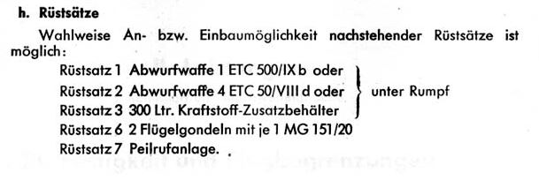 In this listing I've tried to include "Rüststand" and "Umrüst-Bausätze" designations. From the F series onwards, these were built into aircraft on the production line or during major overhauls away from the front line. The Rüststand modification to suit a certain role was given the suffix /R followed by a number in Arabic numerals, for example "/R2". The Umrüst-Bausätze modification, usually issued in a pre-packed kit-of-parts, was given the suffix /U followed by an Arabic numeral, for example, "U4". The /R designation should not be confused with the "Rüstsätze" field modifications which were usually done at operational airfields. These added extra functionality or weapons to aircraft. Confusingly the Rüstsätze field modifications also carried the designation "R". Some writers say that "Rüstsätze" modifications used Roman numerals, for example "RIII". This has obviously caused great confusion over the years, not least because the meaning of "Rüstsätze" listings seems to have changed during the course of the war. Here is an example of a Rüstsätze designation listing from the German wartime manual for the Bf109 G-6/U4. It does not use Roman numerals.