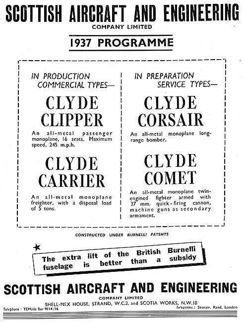 A press advertisement from 1937 showcasing the range of Burnelli-inspired projects the Scottish Aircraft and Engineering Company was working on. The "subsidy" mentioned in the text refers to the financial assistance that governments provided to most airlines during that period to make them viable. This was often in the form of payments for carrying air mail.