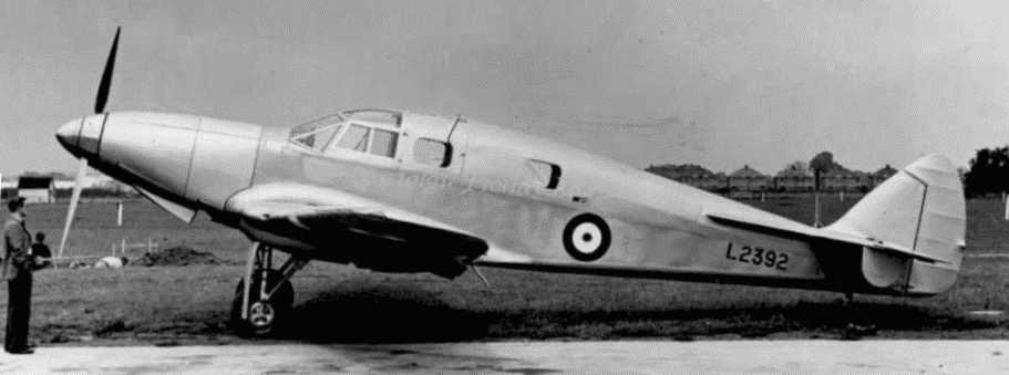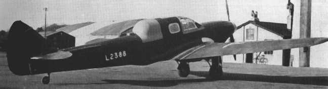 The Don prototype at the Hendon Airshow in June 1937, only 8 days after it had first flown. This time photographed with "normal" film. It is wearing the "new types" number 1 to identify it to the public from a list printed in the official programme. It is still in its original configuration with a dummy turret and prior to the fitting of finlets. Notice the trailing step to give access onto the wing. However getting onto the wing was still difficult, even with this aid.