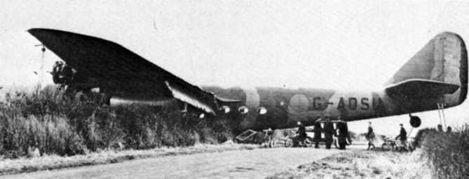 With the outbreak of war, the Ensigns were at first crudely camouflaged (it would seem one joker went so far as to paint a flock of sheep on the huge wings of one!) and operated by the National Air Communications service. They helped fly out the groundcrews of RAF squadrons to France in the first weeks of the war, with the first such flight taking place on the 2nd of September 1939, the day before the formal declaration of war. Then the Ensigns were used to provide a twice-daily service to Paris and also carried out supply flights for the RAF and Army. Some Ensigns seem to have been operated by, or under the control of, number 24 Squadron of the RAF. The Ensigns gave valuable service through the severe winter of 1939/40. On December 15th 1939 the fleet had its first casualty when G-ADSU Euterpe, on a flight from Whitchurch (Bristol) to Doncaster, tried to land to avoid an approaching weather front and overshot the tiny landing ground called Bonniksen's airfield (owned by Major Julius Bonniksen) near Leamington Spa in Warwickshire.² It seems this tiny airfield was just too small for even the Ensign's renowned short-field performance, particularly as the pilot assumed the road and ditch he ended up in was a "painted on" camouflage feature. The aircraft was returned to Hamble by road in March of the following year. It's hard to imagine the huge airframe being manoeuvred down the narrow twisting roads of pre-motorway Britain!