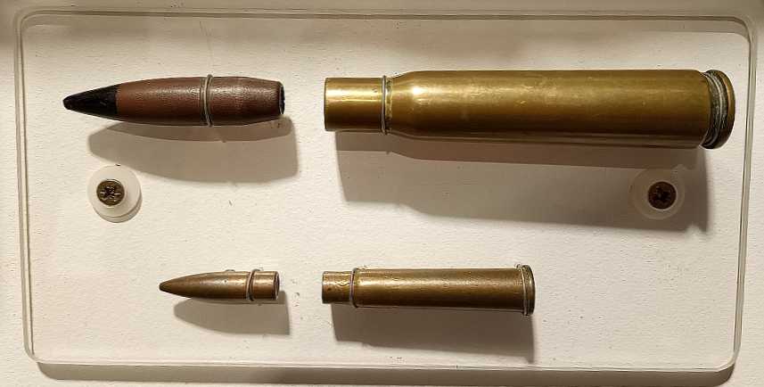 Comparison of the sizes of a .50 bullet (top) and a .303 Bullet (bottom) from a display at the excellent City of Norwich Aviation Museum.