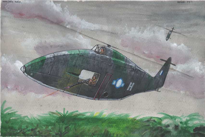The PD 7 was to have been a larger two-seat design for a helicopter. It had the same type of thin, flat-sided fuselage to counter torque and the added refinement of a retracting undercarriage. It could be armed with a large cannon or machine gun fired through the side openings by the second crewman. I've painted it as if it had seen action in the Far East.