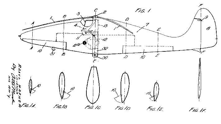 Diagram from Hafner's helicopter patent showing the asymmetrical aerofoil profiles of the fuselage and the system of control.