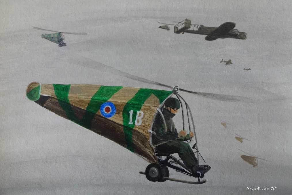 The evolved Rotachute would need to be towed all the way to the target (extremely slowly and with great discomfort to the pilot) but it was suggested that aircraft could be modified to carry some Rotachutes suspended from a bar. The Rotachutes would then be run out in turn to the end of the bar to allow the rotors to spin up before being dropped. The painting above imagines an A.W. Whitley modified for this purpose.