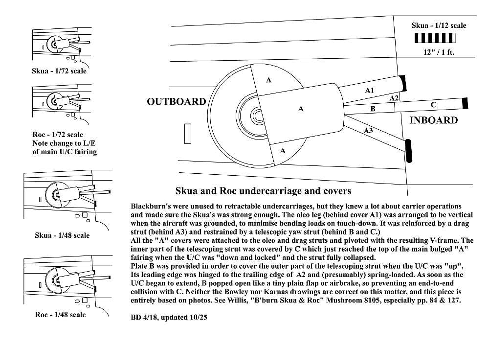 No model of the Skua or Roc gets the undercarriage covers completely right. The diagram below was prepared by Brian Derbyshire to illustrate the configuration. Note in particular panel "B" which ends up at right angles to the airflow once the u/c is extended. Also, note there was a subtle difference between the undercarriage of the Skua and the Roc.