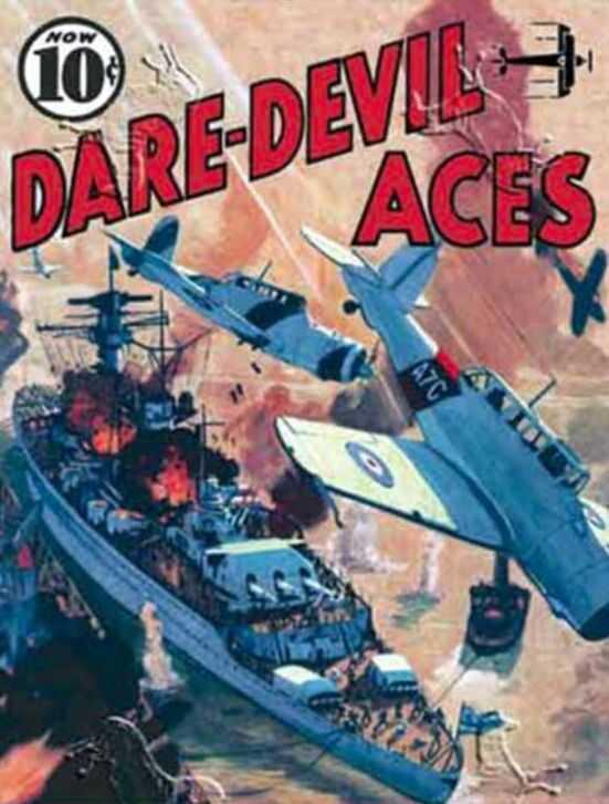 This splendid cover to an American comic book was clearly meant to show the attack on the Königsberg. The artist has used the limited photos of Skuas available at the time. So the nearest Skua is in pre-war markings (see photo near the top of this page, clearly the photo the artist copied) and the Skua behind it has the black stripes of a target tug, (actual target tug markings were black on yellow "tiger stripes"). The ship is not the Königsberg but is copied from pre-war photos of the pocket battleship Graf Spee. I do not think the little 24lb bombs tumbling from the second Skua would have done much harm to a pocket battleship! For my own attempt at a painting of the attack on the Königsberg CLICK HERE.