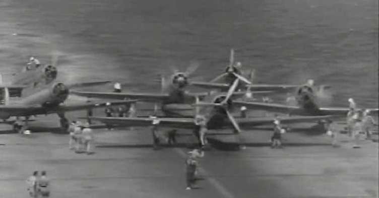Skuas on HMS Ark Royal, ranged for take-off. A still from the wartime feature-film "Ships with Wings".