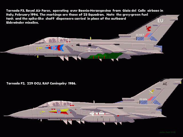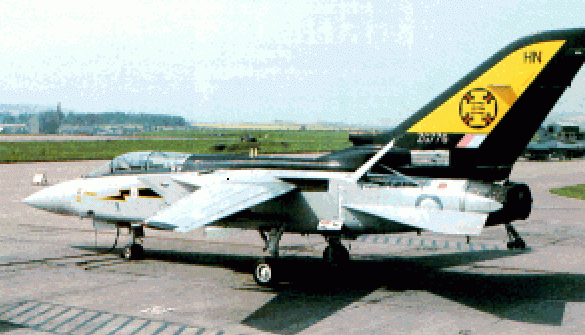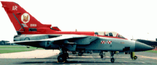 The ADV version carries a Foxhunter radar in a redesigned nose. This can detect aircraft at over 115 miles range. The aircraft is lengthened to allow the fitting of four Skyflash missiles beneath the fuselage. The ADV has only a single, rear-facing, radar detecting pod on top of the tail. The ADV has a neat retracting in-flight refuelling probe, whereas the IDS versions were manufactured without such a probe and need an ugly bulge on the starboard side to accommodate one added later. The first ADV took to the air on 27th November 1979. The first batch, called the F Mk2, had the same Mk101 engines as the IDS version and control of the wing-sweep was manual, again like the IDS. The F Mk 3 has more powerful Mk104 engines and wing sweep control is automatic, along with other avionics improvements. The F Mk 2s were upgraded to Mk 3 standard except for the engines. In this form, they are known as F Mk 2A. The first F Mk3s were delivered to the RAF in July 1986. All of the FMk2s have been put into storage.