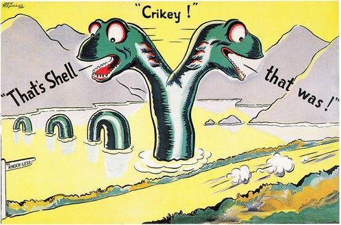 One of the numerous adverts for Shell petrol in the 1930s that featured the slogan "Crikey! -That's Shell, that was!", which became a catchphrase signifying anything that was exceptionally fast. The nickname "Crikey!" was given to the Whirlwind. The term crikey has largely fallen out of use in the UK but continues to be used in Australia (where it was a catchphrase of the zoologist and TV presenter Steve Irwin). You get an extra point if you understand the pun on the signpost.