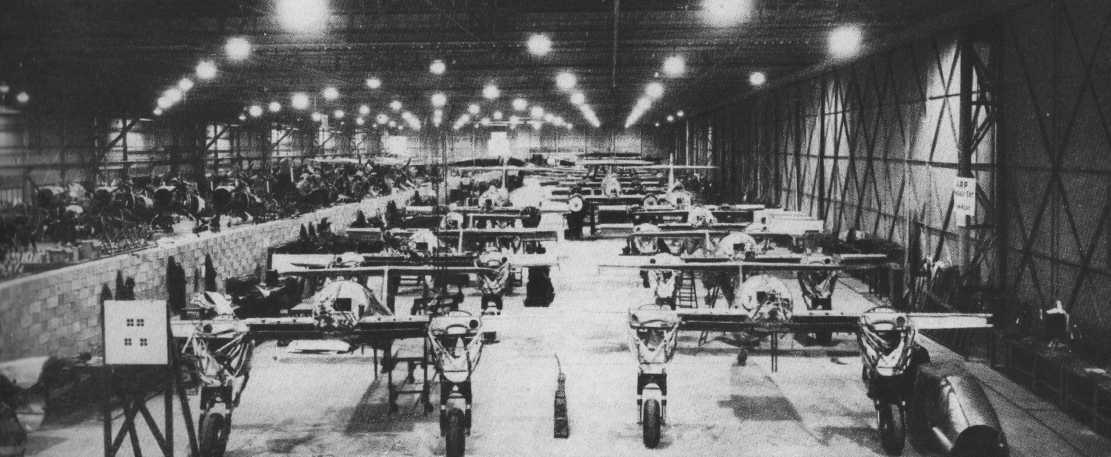 A table of the proposed production of British aircraft for 1940³ (compiled in December 1939) reveals that the first Whirlwind off the production line was expected in March 1940, peaking at 16 aircraft a month in September, with the last of the 114 to be delivered in January 1941. Even this modest expectation was to prove ambitious. The first production aircraft was not delivered until May 1940 with a dribble of deliveries (sometimes only 2 aircraft in a month) continuing until the last one was handed over in January 1942. The bottle-neck in production seems to have been the delivery of Peregrine engines, as soon as a pair of engines was available another Whirlwind would roll out the end of the production line. In the photograph of the interior of the Westland factory below, you can see two rows of Whirlwinds stretching off into the distance, all looking substantially complete, just missing their engines.